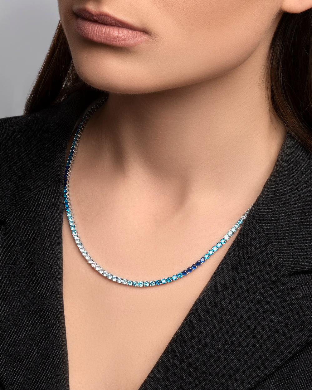 Tennis chains are the most in item and are great for decorating your neckline with something that stands out and looks beautiful. This classic thick tennis chain is the ideal item for tennis chain lovers and features a range of beautiful blue quartz for something unique that stands out.